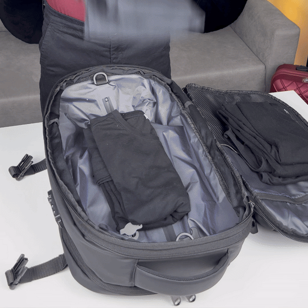 Plecak wykorzystuje technologię próżniową, aby zmaksymalizować przestrzeń i zminimalizować koszty, zapewniając wygodę na każdym kroku podróży.